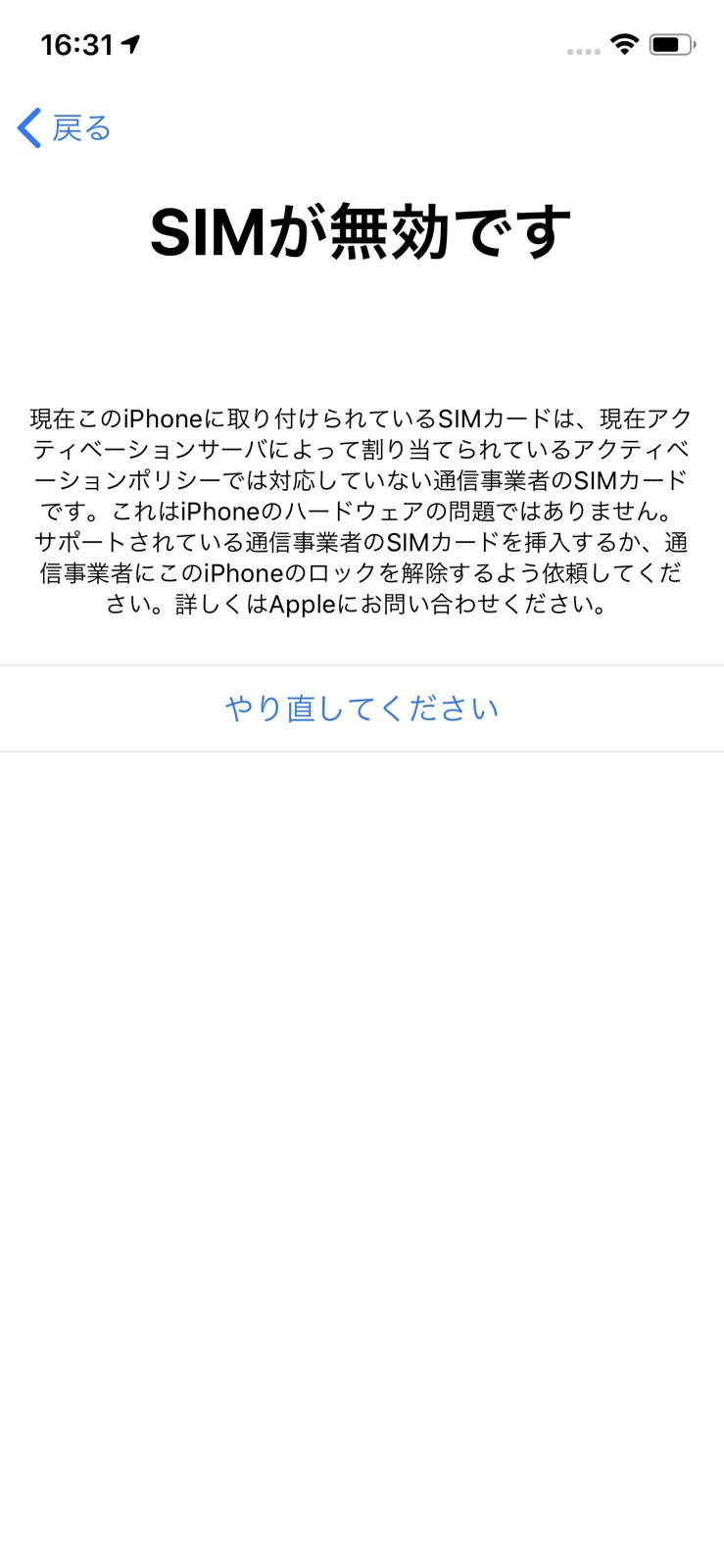 そんなエラー表示を解消するためにSIMフリー手続きをしたら解決できました。